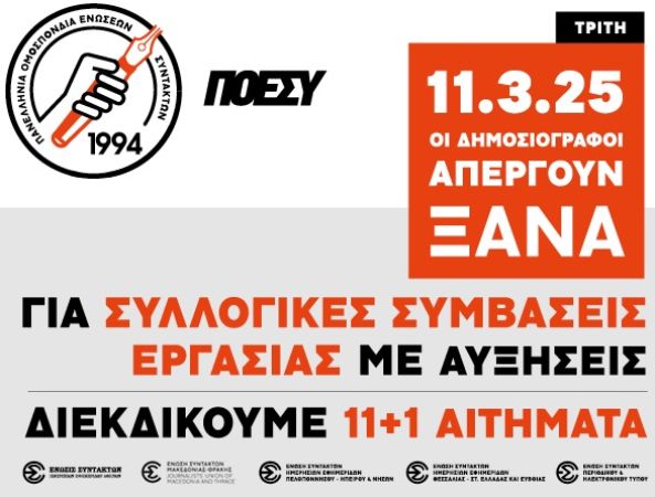Τα Διοικητικά Συμβούλια της Πανελλήνιας Ομοσπονδίας Συντακτών (ΠΟΕΣΥ) και των δημοσιογραφικών Ενώσεων – μελών της (ΕΣΗΕΑ, ΕΣΗΕΜΘ, ΕΣΗΕΠΗΝ, ΕΣΗΕΘΣτΕΕ και ΕΣΠΗΤ) συναποφάσισαν την πραγματοποίηση νέας εικοσιτετράωρης απεργίας για όλους τους δημοσιογράφους, σε όλα τα ΜΜΕ της χώρας, από τις 5 το πρωί της Τρίτης, 11 Μαρτίου μέχρι τις 5 το πρωί της Τετάρτης, 12 Μαρτίου 2025.