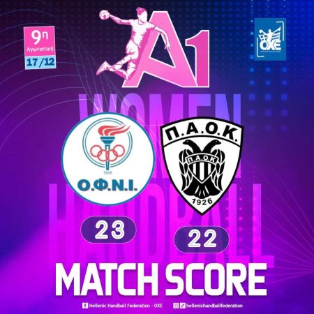 Πρωταθλήτρια χειμώνα αναδείχθηκε η Νέα Ιωνία που επικράτησε 23-22 του ΠΑΟΚ Mateco στο μεγάλο ντέρμπι της 9ης και τελευταίας αγωνιστικής του Α’ γύρου της Α1 Γυναικών.