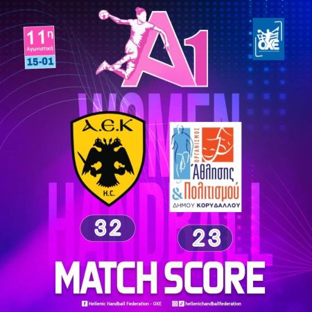 Χωρίς να δυσκολευτεί η ΑΕΚ επικράτησε του Κορυδαλλού με 32-23 για την 11η αγωνιστική της Α1 γυναικών και μείωσε στους δύο βαθμούς της διαφορά της από την τέταρτη της βαθμολογίας, Αναγέννηση Άρτας.