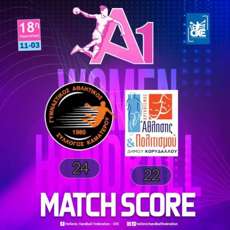 Στο πλαίσιο της τελευταίας αγωνιστικής της Α1 γυναικών η ομάδα του Καματερού επικράτησε με 24-22 και καταλαμβάνει την 7η θέση στην τελική κατάταξη, ενώ ο Κορυδαλλός τερματίζει όγδοος, έχοντας εξασφαλίσει την παραμονή στην κατηγορία.