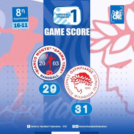 Την 7η συνεχόμενη νίκη του στη Handball Premier πανηγύρισε ο Ολυμπιακός ΣΦΠ/Όμιλος Ξυνή που επικράτησε με 31-29 της μαχητικής Bianco Monte Δράμας για την 8η αγωνιστική του πρωταθλήματος.