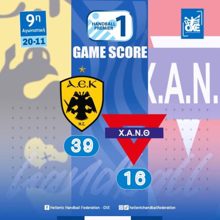 Μόνη πρώτη στην κορυφή της Handball Premier επέστρεψε η ΑΕΚ που επιβλήθηκε 39-16 της ΧΑΝΘ στο κλειστό του Βύρωνα για την 9η αγωνιστική του πρωταθλήματος.