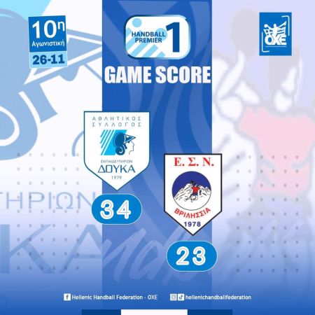 Ο ΑΣΕ Δούκα ήταν ο νικητής στο ντέρμπι των Βορείων προαστίων. Ο Σύλλογος των Εκπαιδευτηρίων επικράτησε των Βριλησσίων με 34-23, για την 10η αγωνιστική της Handball Premier.