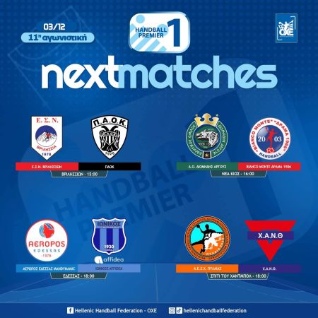 Με τη διεξαγωγή τεσσάρων αγώνων, ολοκληρώνεται αύριο η 11η αγωνιστική της Handball Premier που σηματοδοτεί και το φινάλε του Α’ γύρου του πρωταθλήματος.