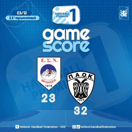 Ο ΠΑΟΚ πέρασε από την έδρα των Βριλησσίων, επικρατώντας με 32-23 στο φινάλε του Α’ γύρου της Handball Premier που τον βρίσκει στην 3η θέση της βαθμολογίας με 17 πόντους.
