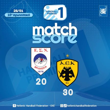Συνέχισε στα νικηφόρα αποτελέσματα η ΑΕΚ που επιβλήθηκε 30-20 των Βριλησσίων εκτός έδρας για τη 16η αγωνιστική της Handball Premier. Για τα Βριλήσσια ντεμπούτο έκανε ο Κροάτης περιφερειακός Γιάκιτς που σκόραρε 4 φορές, ενώ απουσίασε λόγω ασθένειας ο τεχνικός της ομάδας Θάνος Τούτσης.