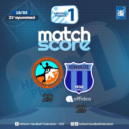 Με δύο γκολ του Μπούτου στο τελευταίο λεπτό ο Ιωνικός Affidea πήρε το «χρυσό» βαθμό της ισοπαλίας (29-29) κόντρα στην Πυλαία στο «Σπίτι του Χάντμπολ», αποτέλεσμα που διατηρεί και μαθηματικά τις δύο ομάδες στη Handball Premier!