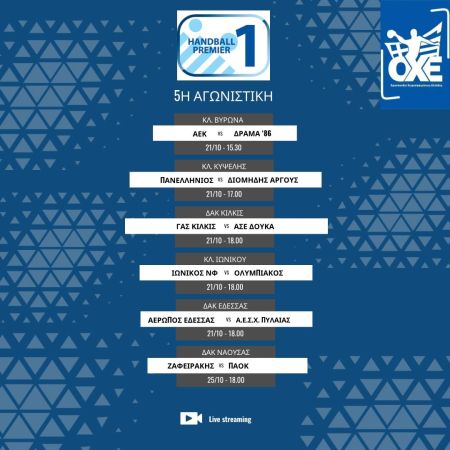 Mε πέντε παιχνίδια συνεχίζεται αύριο η Handball Premier και συγκεκριμένα για την 5η αγωνιστική του πρωταθλήματος. Την Τετάρτη με το παιχνίδι Ζαφειράκης- ΠΑΟΚ, λόγω της ευρωπαϊκής μάχης του “Δικεφάλου” του Βορρά με την Λιντζ (21/10, 20:00) για το EHF European Cup με την ομάδα της Θεσσαλονίκης να θέλει να ανατρέψει το 27-26 της Αυστρίας.