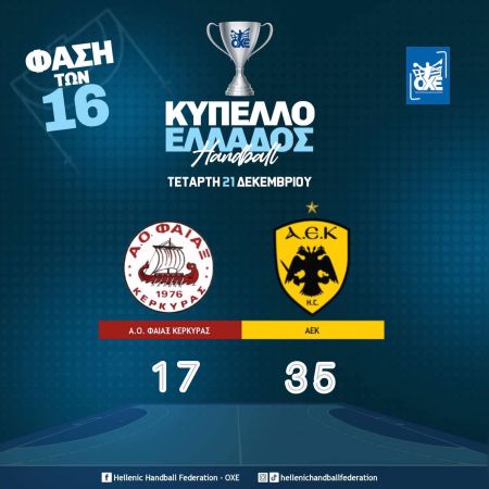 Άνετη πρόκριση πήρε η ΑΕΚ στην οχτάδα του Κυπέλλου Ανδρών, αφού επιβλήθηκε με 35-17 του Φαίακα Κέρκυρας εκτός έδρας.