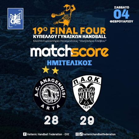 Ο ΠΑΟΚ Mateco νίκησε 29-28 την Αναγέννηση Άρτας στον 1ο ημιτελικό του 19ου Final Four του Κυπέλλου Γυναικών που διεξάγεται στην Ηγουμενίτσα και προκρίθηκε για 9η φορά στην ιστορία του στον τελικό.