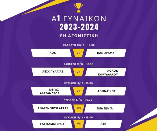 Με την διεξαγωγή της 9ης αγωνιστικής ολοκληρώνεται ο Α’ γύρος και στο πρωτάθλημα της Α1 Γυναικών.