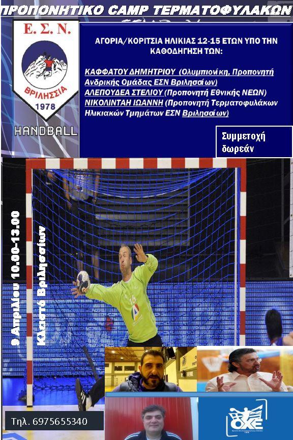 Ο Ε.Σ.Ν. Βριλησσίων σε συνεργασία με την ΕΑΠ/ΟΧΕ θα πραγματοποιήσει το 1ο προπονητικό καμπ τερματοφυλάκων για αθλητές και αθλήτριες 12-15 ετών, την Κυριακή 9 Απριλίου 2017 στο κλειστό γυμναστήριο Βριλησσίων και ώρες: 10:00-13:00.