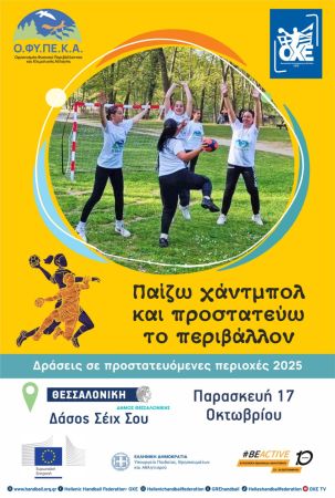 Ομοσπονδία Χειροσφαιρίσεως Ελλάδος (ΟΧΕ), Οργανισμός Φυσικού Περιβάλλοντος και Κλιματικής Αλλαγής (ΟΦΥΠΕΚΑ)και Δήμος Θεσσαλονίκης ενώνουν τις δυνάμεις τους για την πραγματοποίηση της καταληκτικής δράσης του προγράμματος για το 2025 με τη συμμετοχή 1.000 μαθητών- μαθητριών από τις σχολικές μονάδες της Θεσσαλονίκης.