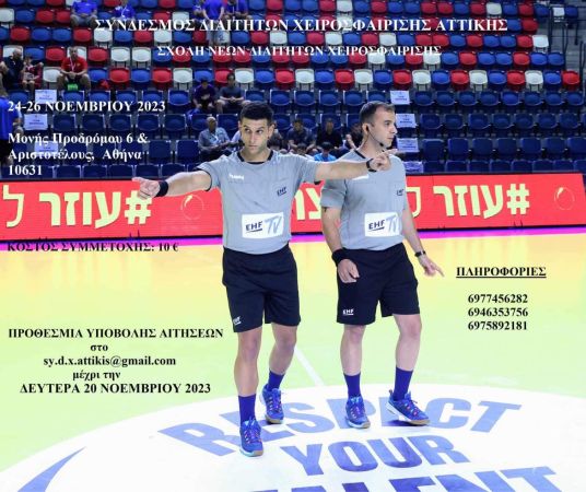 Ο Σύνδεσμος Διαιτητών Χειροσφαίρισης Αττικής (ΣΥ.Δ.ΧΑ) θα πραγματοποιήσει Σχολή Διαιτησίας στο διάστημα 24-26 Νοεμβρίου 2023. Τα μαθήματα της Σχολής θα γίνουν στα γραφεία του Συνδέσμου, στην οδό Μονής Προδρόμου 6 και Αριστοτέλους στην Πλατεία Βικτωρίας.