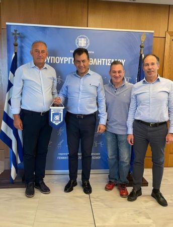Συνάντηση με το νέο Αναπληρωτή Υπουργό Αθλητισμού, Γιάννη Βρούτση είχαν ο πρόεδρος της ΟΧΕ, Κωστας Γκαντής, ο αντιπρόεδρος Στέφανος Σταμούλης και ο Γενικός Γραμματέας της Ομοσπονδίας, Κώστας Σταματιάδης.