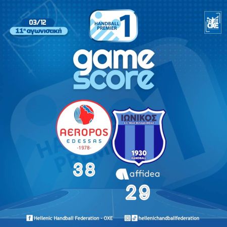 Στην 6η θέση της βαθμολογίας της Handball Premier με 10 πόντους –μαζί με τον Δούκα- ανέβηκε ο Αερωπός Έδεσσας που βρίσκεται σε εντυπωσιακή φόρμα και μετά το «διπλό» στη Δράμα, επιβλήθηκε άνετα με 38-29 του Ιωνικού Affidea.