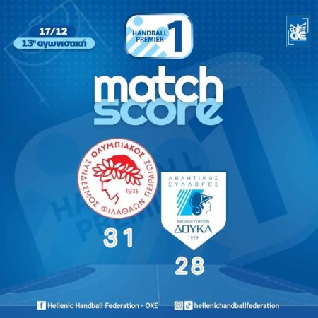 Ο Ολυμπιακός αν και δυσκολεύτηκε επικράτησε του ΑΣΕ Δούκα με 31-28, στο πλαίσιο της 13ης αγωνιστικής και διατηρήθηκε στην κορυφή του βαθμολογικού πίνακα της Handball Premier.