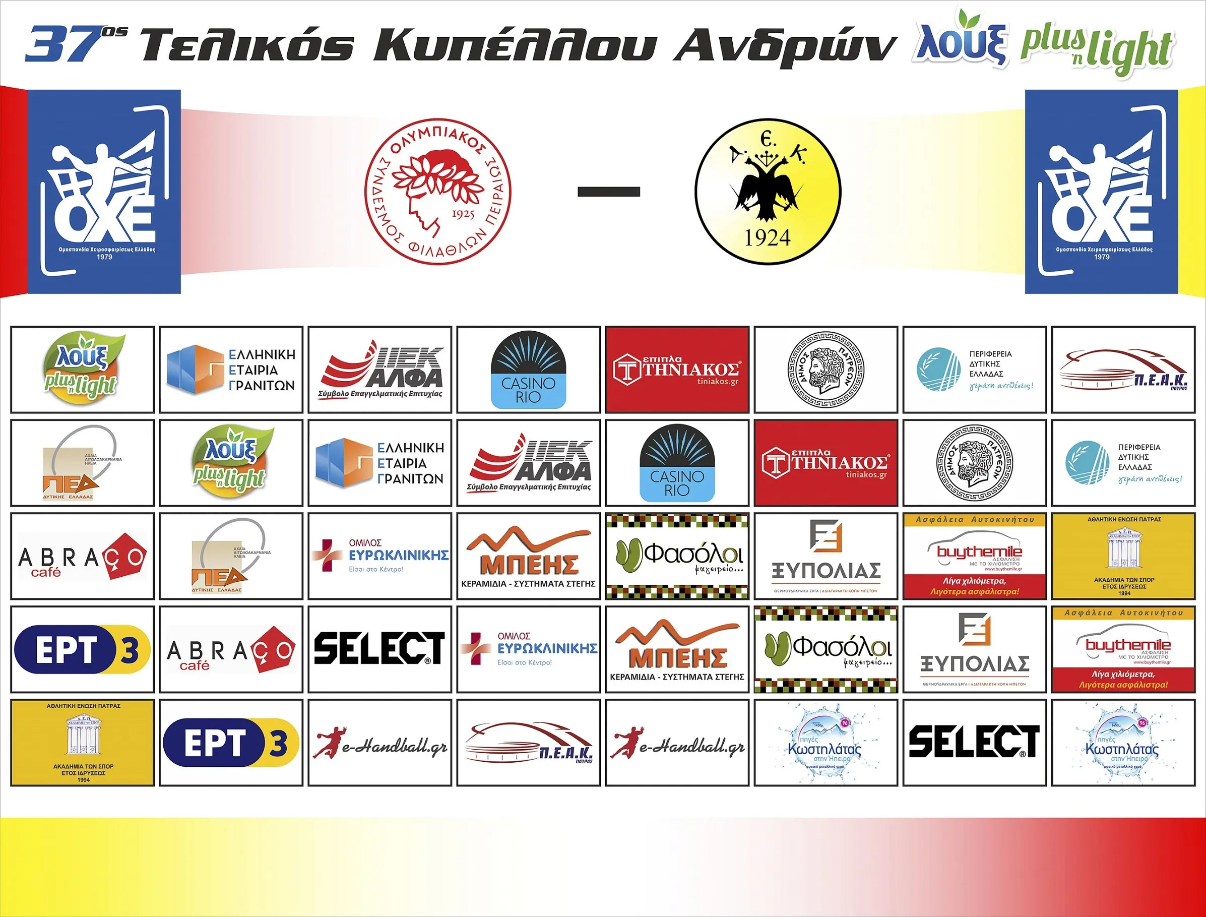 Η Ομοσπονδία Χειροσφαιρίσεως Ελλάδος ανακοινώνει ενόψει του 37ου τελικού του Κυπέλλου Ανδρών «Λουξ Plus ‘n Light» Ολυμπιακός ΣΦΠ/ Όμιλος Ξυνή- ΑΕΚ στο κλειστό γυμναστήριο Πάτρας «Κουκούλι», αύριο 16 Μαρτίου 2019, ώρα 17:00.